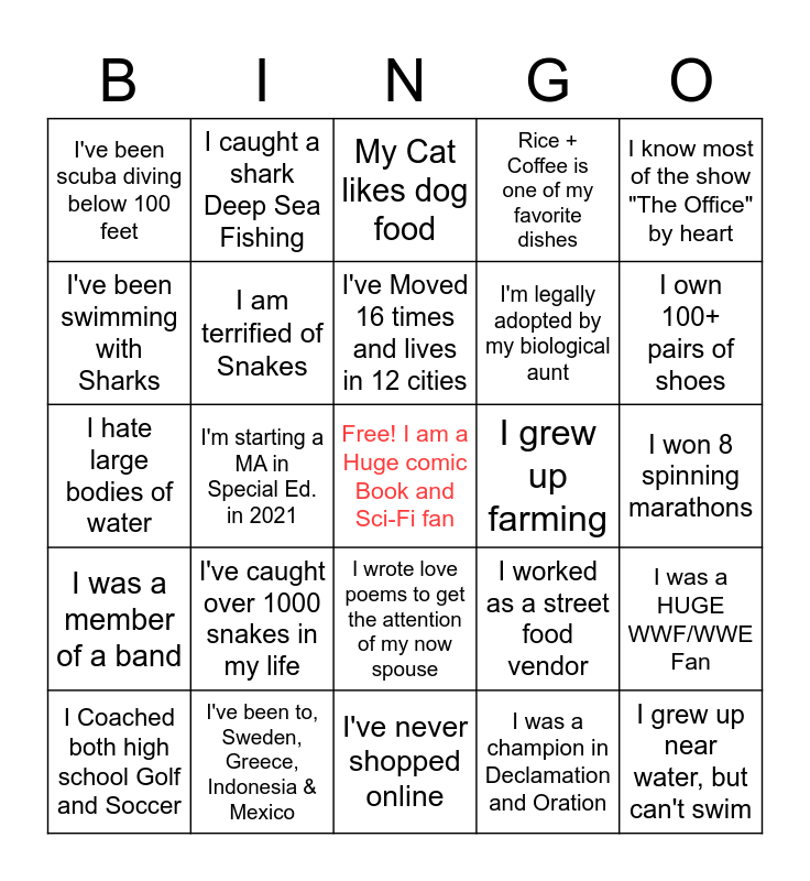 This bingo card has a free space and 24 words: I've caught over 1000 snakes in my life, I've been to, Sweden, Greece, Indonesia & Mexico, I've Moved 16 times and lives in 12 cities, I Coached both high school Golf and Soccer, I know most of the show "The Office" by heart, I've been scuba diving below 100 feet, I've been swimming with Sharks, I caught a shark Deep Sea Fishing, I grew up farming, I wrote love poems to get the attention of my now spouse, I'm legally adopted by my biological aunt, I hate large bodies of water, I worked as a street food vendor, I was a HUGE WWF/WWE Fan, I am terrified of Snakes, I was a champion in Declamation and Oration, I won 8 spinning marathons, My Cat likes dog food, I own 100+ pairs of shoes, I'm starting a MA in Special Ed. in 2021, I grew up near water, but can't swim, I was a member of a band, Rice + Coffee is one of my favorite dishes and I've never shopped online.