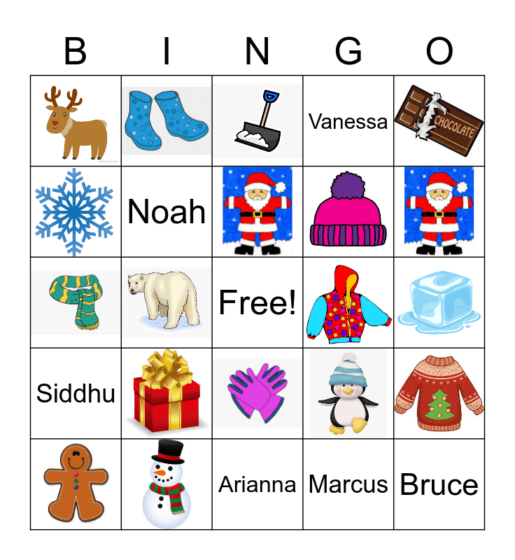 This bingo card has 18 images, a free space and 6 words: Noah, Marcus, Bruce, Siddhu, Vanessa and Arianna.