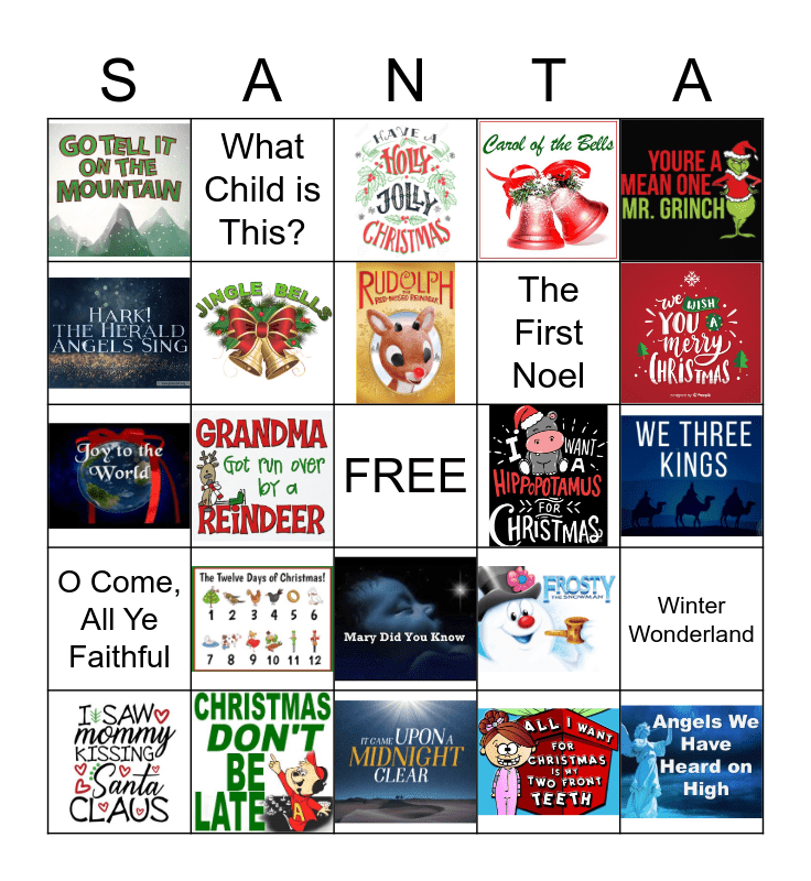 This bingo card has 27 images, a free space and 6 words: Silent Night, O Come, All Ye Faithful, What Child is This?, I Heard the Bells on Christmas Day, The First Noel and Winter Wonderland.