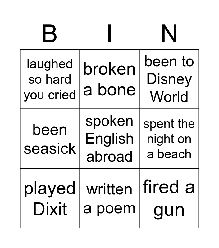 This bingo card has 22 words: dyed your hair, baked a cake, broken a bone, had dental braces, spent the night on a beach, played Dixit, laughed so hard you cried, been to Disney World, had a pet fish, lied about your age, fired a gun, been seasick, been waterskiing, made a prank phone call, had a tattoo, lost your keys, ridden a horse, flown in a balloon, fallen asleep at school, spoken English abroad, written a poem and been camping.