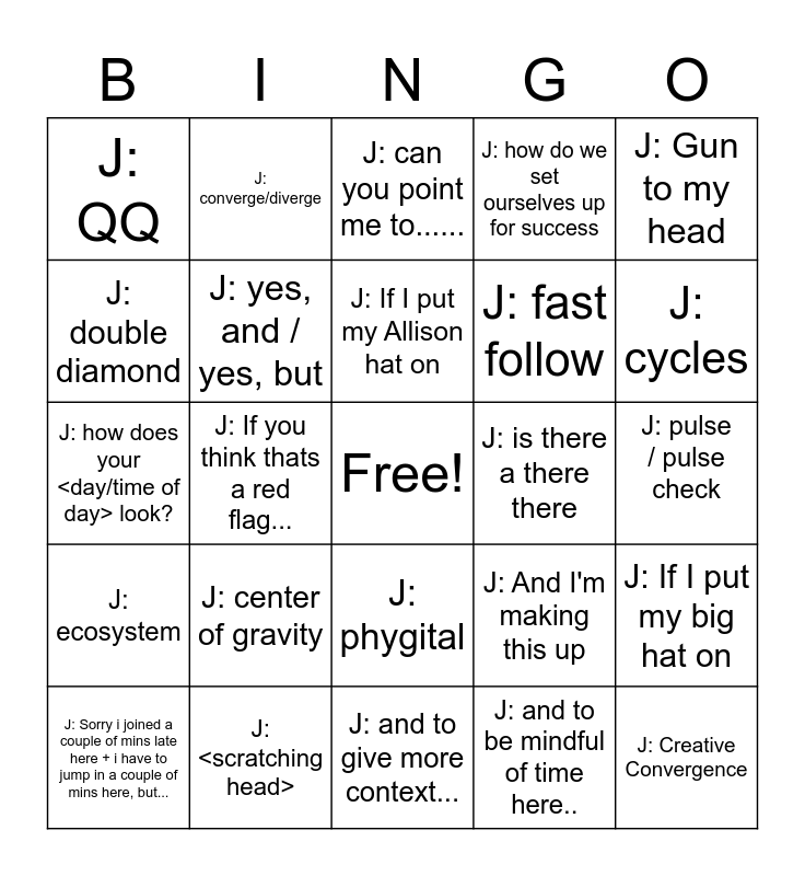 This bingo card has a free space and 24 words: J: center of gravity, J: <scratching head>, J: If I put my Allison hat on, J: Sorry i joined a couple of mins late here + i have to jump in a couple of mins here, but..., J: Gun to my head, J: QQ, J: double diamond, J: converge/diverge, J: is there a there there, J: phygital, J: fast follow, J: how does your <day/time of day> look?, J: And I'm making this up, J: If I put my big hat on, J: yes, and / yes, but, J: and to be mindful of time here.., J: pulse / pulse check, J: can you point me to......, J: cycles, J: If you think thats a red flag..., J: Creative Convergence, J: ecosystem, J: how do we set ourselves up for success and J: and to give more context....