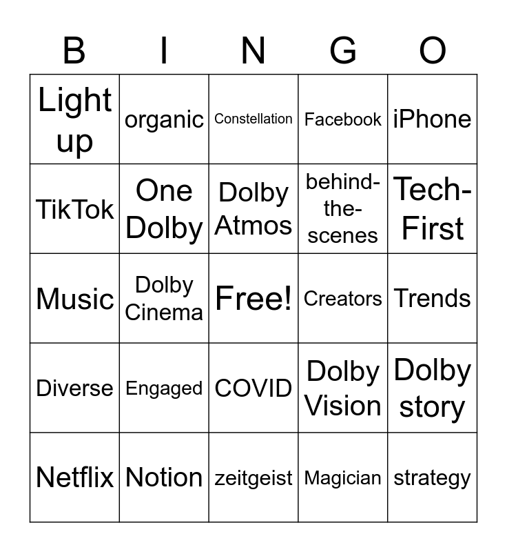 This bingo card has a free space and 29 words: Netflix, POV, Dolby Cinema, Passion, Light up, Constellation, One Dolby, Engaged, Creators, Notion, Trends, strategy, zeitgeist, Magician, Tech-First, Culture, COVID, Diverse, iPhone, Music, Dolby Vision, Transform, behind-the-scenes, TikTok, Facebook, organic, Dolby story, Dolby Atmos and Dolby On.
