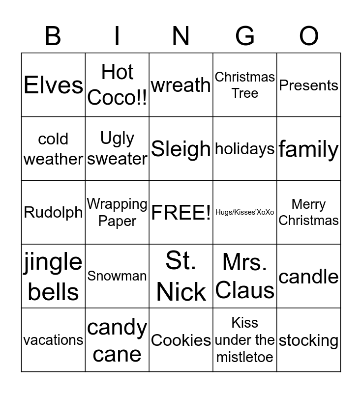 This bingo card has a free space and 24 words: Snowman, candy cane, Sleigh, vacations, Presents, Elves, cold weather, Hot Coco!!, Hugs/Kisses'XoXo, St. Nick, holidays, Rudolph, Mrs. Claus, candle, Ugly sweater, Kiss under the mistletoe, Merry Christmas, wreath, family, Wrapping Paper, stocking, jingle bells, Christmas Tree and Cookies.