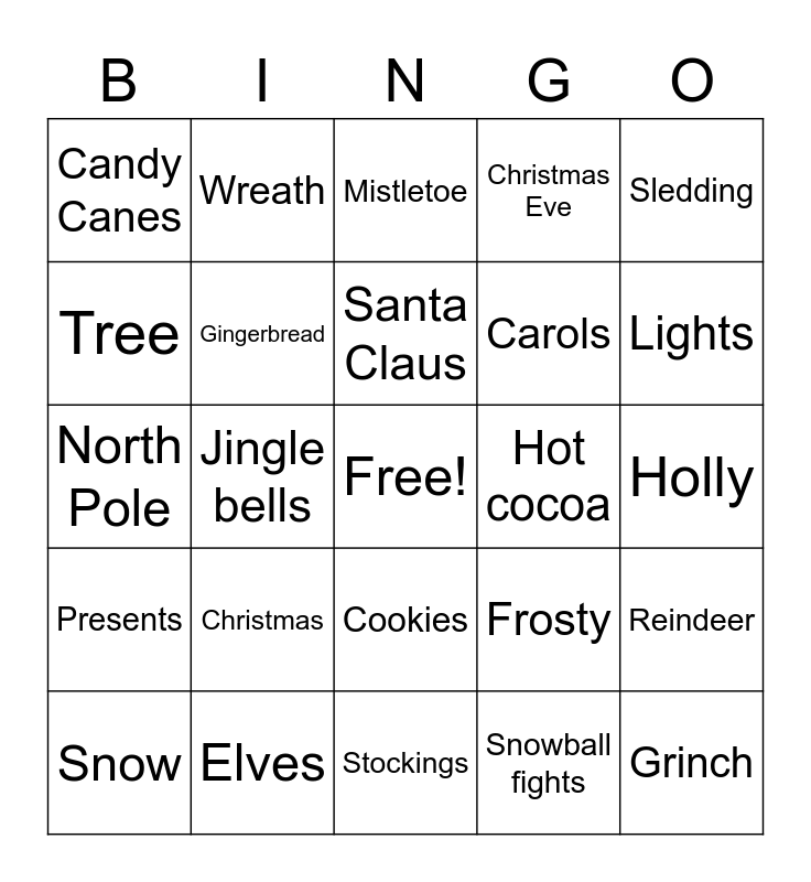 This bingo card has a free space and 24 words: Christmas, Elves, Santa Claus, Snow, Sledding, Candy Canes, Tree, Wreath, Hot cocoa, Cookies, Carols, North Pole, Frosty, Reindeer, Gingerbread, Snowball fights, Holly, Mistletoe, Lights, Jingle bells, Grinch, Presents, Christmas Eve and Stockings.