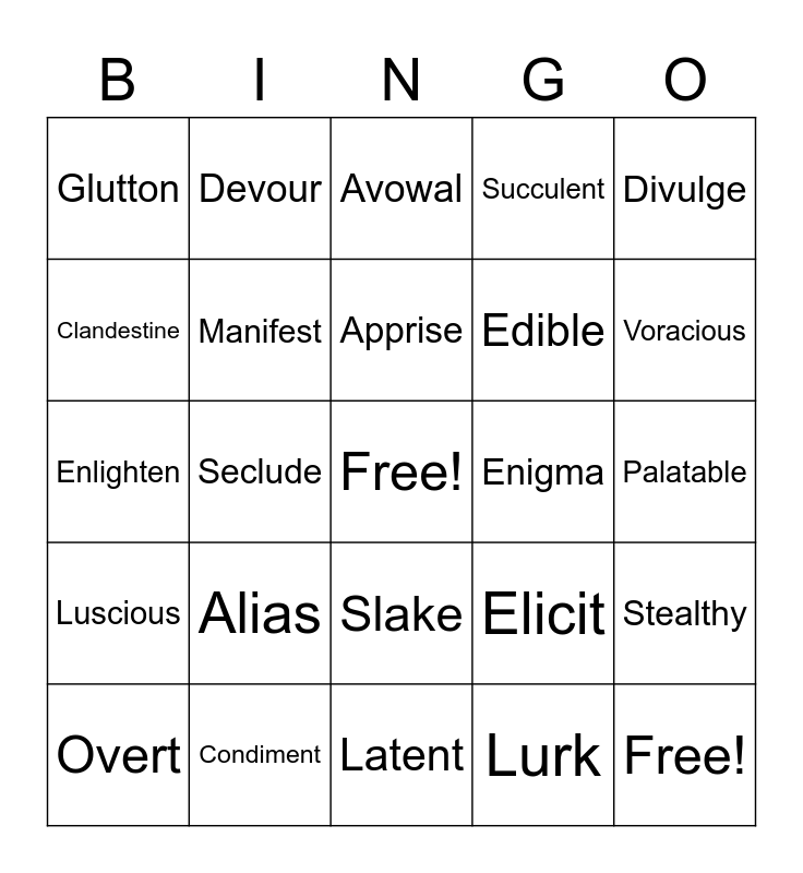 This bingo card has a free space and 24 words: Alias, Condiment, Apprise, Overt, Divulge, Glutton, Clandestine, Devour, Enigma, Slake, Edible, Enlighten, Elicit, Stealthy, Manifest, Lurk, Palatable, Avowal, Voracious, Seclude, Free!, Luscious, Succulent and Latent.