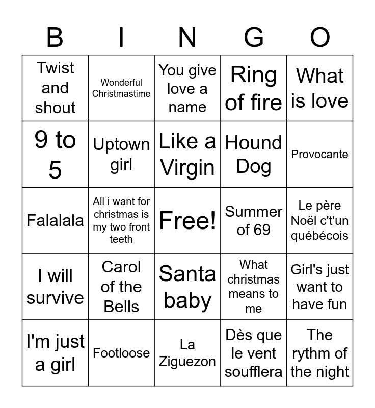 This bingo card has a free space and 61 words: The land of confusion, Footloose, YMCA, I will survive, Dès que le vent soufflera, Marcia Baila, Uptown girl, 23 décembre, Hound Dog, Blue Christmas, Ring of fire, Personal Jesus, 9 to 5, Surfin' USA, You can't hurry love, Twist and shout, The rythm of the night, What is love, Man i feel like a Woman!, Like a Virgin, Summer of 69, You give love a name, I'm just a girl, Girl's just want to have fun, You Can't Always Get What You Want, alors on danse, Cotton eye joe, Les ailes d'un ange, Provocante, Achy Breaky Danse, Les sentiers de neige, Rockin' Around the Christmas tree, Happy Xmas (war is over), All I want for Christmas (is you), Wonderful Christmastime, Baby, its cold outside, Merry Christmas Baby, All i want for christmas is my two front teeth, Frosty the snowman, Falalala, Feliz Navidad, Carol of the Bells, Le père Noël c't'un québécois, Santa Claus is coming to town, What christmas means to me, Jingle bell rock, I saw mommy kissing santa claus, Marie-Noël, le bonhomme de neige, Santa baby, La Ziguezon, Uptown Funk, Crazy in love, Dance Monkey, Wannabe, Beat It, Tainted Love, Cake by the ocean, Mele Kalikimaka, It's the most wonderful time of the year and Grandma got run over by a reindeer.