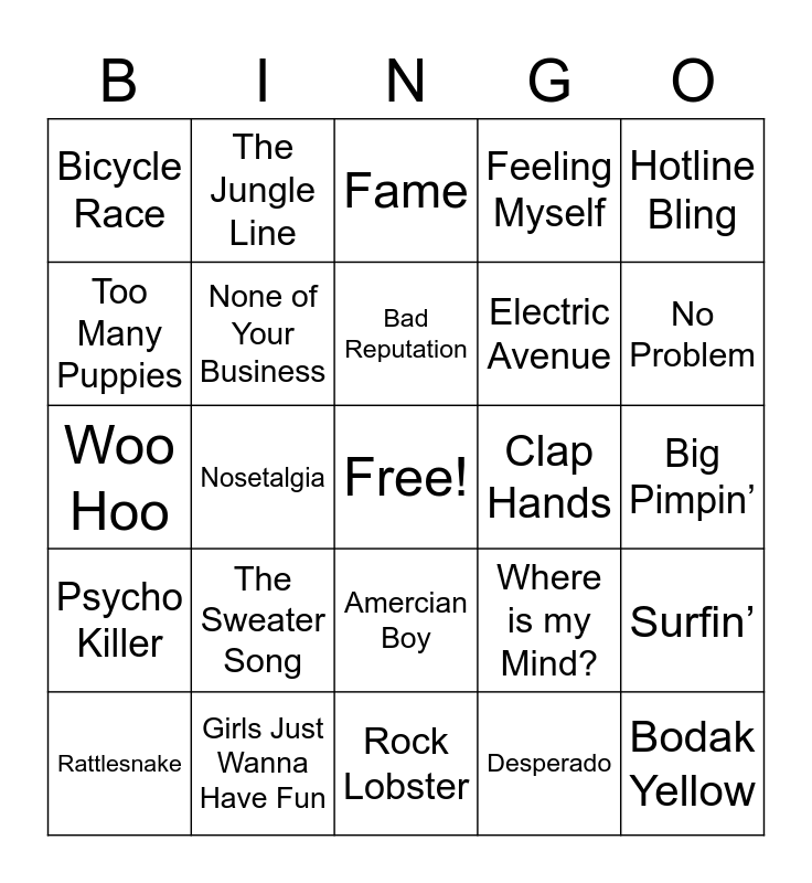 This bingo card has a free space and 41 words: Walk Like an Egyptian, Woo Hoo, Tomboy, None of Your Business, Girls Just Wanna Have Fun, Amercian Boy, Bad Reputation, Muffin Man, Hotline Bling, Psycho Killer, Nosetalgia, Feeling Myself, Bodak Yellow, Big Pimpin’, Clap Hands, The Sweater Song, Bad Girls, Bicycle Race, So Fresh, So Clean, Fame, Surfin’, Uncontrollable Urge, Rock Lobster, Electric Avenue, Monster, Daft Punk is Playing at My House, Desperado, Formation, No Problem, I Can’t Hardly Stand It, Erase You, The Jungle Line, Rattlesnake, Leavin’ On Your Mind, Where is my Mind?, Too Many Puppies, I Put a Spell on You, Cranes in the Sky, Only Love Can Break Your Heart, Crazy On You and 50 Ways to Leave Your Lover.