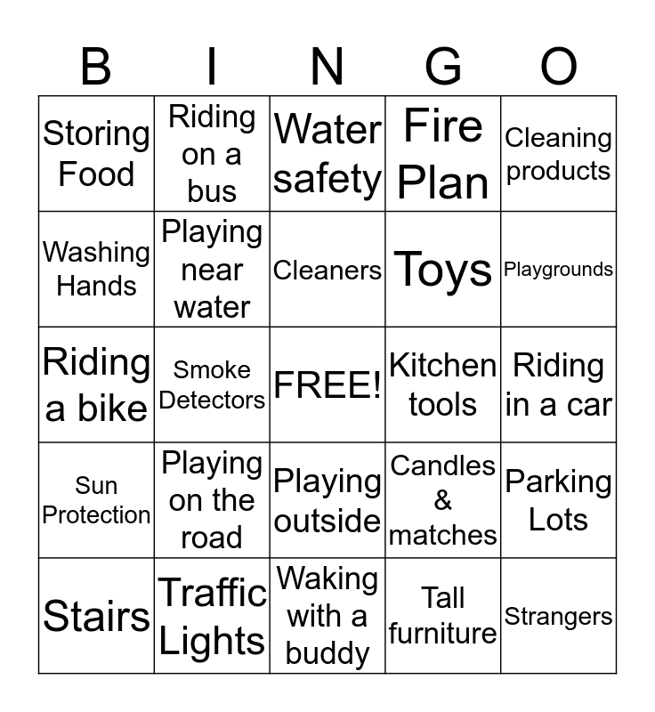This bingo card has a free space and 24 words: Playing on the road, Traffic Lights, Cleaners, Stairs, Cleaning products, Storing Food, Washing Hands, Riding on a bus, Kitchen tools, Playing outside, Toys, Riding a bike, Candles & matches, Parking Lots, Playing near water, Tall furniture, Riding in a car, Water safety, Playgrounds, Smoke Detectors, Strangers, Sun Protection, Fire Plan and Waking with a buddy.
