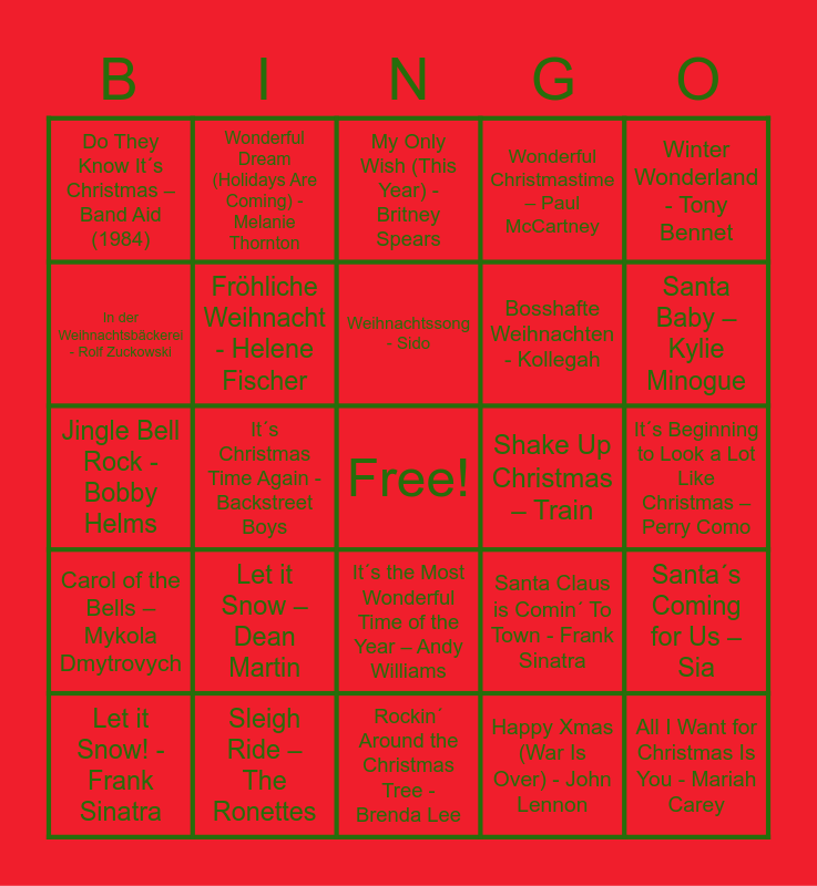This bingo card has a free space and 44 words: Driving Home for Christmas – Chris Rea, All I Want for Christmas Is You - Mariah Carey, White Christmas - Bing Crosby, Let it Snow! - Frank Sinatra, Feliz Navidad - Jose Feliciano, Happy Xmas (War Is Over) - John Lennon, My Only Wish (This Year) - Britney Spears, Mary´s Boy Child – Boney M., Winter Wonderland - Tony Bennet, Sleigh Ride – The Ronettes, Wonderful Christmastime – Paul McCartney, Shake Up Christmas – Train, It´s the Most Wonderful Time of the Year – Andy Williams, Let it Snow – Dean Martin, Merry XMas Everybody - Slade, Rockin´ Around the Christmas Tree - Brenda Lee, I Wish It Could Be Christmas Everyday – Wizzard, Jingle Bell Rock - Bobby Helms, Mistletoe - Justin Bieber, Santa Baby – Kylie Minogue, Wonderful Dream (Holidays Are Coming) - Melanie Thornton, Thank God It´s Christmas - Queen, Merry Christmas Everyone - Shakin´Stevens, Do They Know It´s Christmas – Band Aid (1984), Christmas Time – Bryan Adams, It´s Beginning to Look a Lot Like Christmas – Perry Como, Shake Up Christmas 2011 – Natasha Bedingfield, In der Weihnachtsbäckerei - Rolf Zuckowski, Santa Claus is Comin´ To Town - Frank Sinatra, Carol of the Bells – Mykola Dmytrovych, Christmas (Baby Please Come Home) - Mariah Carey, Santa´s Coming for Us – Sia, Frosty The Snowman - The Beach Boys, Drei Haselnüsse für Aschenbrödel (Motiv 1) - Karel Svoboda, It´s Christmas Time Again - Backstreet Boys, Winter Wonderland – Michael Bublé, Last Christmas - Wham!, Es ist für uns eine Zeit angekommen - Rolf Zuckowski, Weihnachtssong - Sido, In der Weihnachtsbäckerei - Rolf Zuckowski, Bosshafte Weihnachten - Kollegah, Letzte Weihancht - Vanessa Mai, Fröhliche Weihnacht - Helene Fischer and Rudolph the Red-Nosed Reindeer.