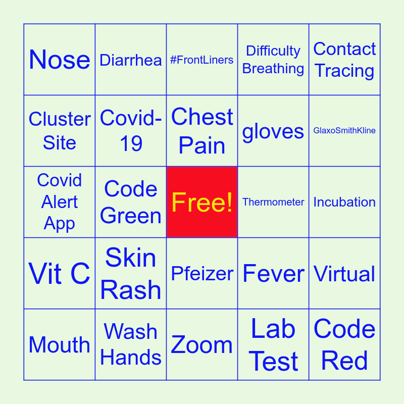 This bingo card has a free space and 75 words: #CovidCases, #FlatCurve, #FrontLiners, #StayHome, Alcohol, AstraZeneca, Asymptomatic, BioNTech, Bubble, Caregivers, CDC, CERB, Chest Pain, Cluster Site, Code Gray, Code Green, Code Orange, Code Red, Code Yellow, Contact Tracing, Coronavirus, Covid Alert App, Covid-19, Diarrhea, Difficulty Breathing, Doctors, Droplet, Dry Coughs, Epidemic, Epidemiology, Eyes, Face Shield, Fatigue, Fever, GlaxoSmithKline, gloves, Head Ache, Immunity, Incubation, Lab Test, Lockdown, Loss of Smell, Loss of Speech, Loss of Taste, Mask, Moderna, Mouth, Nose, Nurses, Outbreak, Pandemic, Pfeizer, PPE, PUI, Quarantine, Sanitizer, Sanofi, SARS-CoV-2, Screening, Self-Isolation, Skin Rash, Social Distancing, Sore Throat, Symptom, Teams, Thermometer, Travel Ban, Vaccine, Ventilator, Virtual, Vit C, Wash Hands, Weakness, Zoom and Zoonotic.