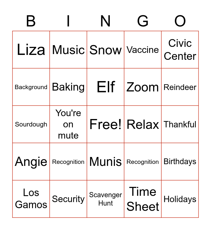 This bingo card has a free space and 29 words: Los Gamos, Hand sanitizer, You're on mute, Ornament, Liza, Snow, Baking, Recognition, Relax, Security, Thankful, Holidays, Scavenger Hunt, Time Sheet, Reindeer, Gingerbread, Munis, Angie, Civic Center, Sourdough, Recognition, Egg Beater, Zoom, Background, Vaccine, Music, Birthdays, Elf and Tree.