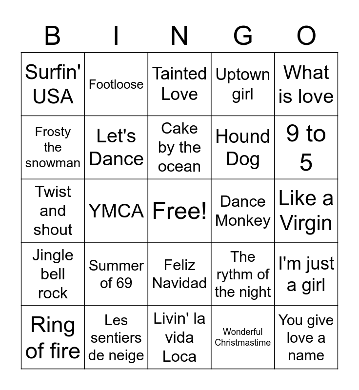 This bingo card has a free space and 72 words: The land of confusion, Footloose, YMCA, I will survive, Dès que le vent soufflera, Marcia Baila, Uptown girl, 23 décembre, Hound Dog, Blue Christmas, Ring of fire, Personal Jesus, 9 to 5, Surfin' USA, You can't hurry love, Twist and shout, The rythm of the night, What is love, Man i feel like a Woman!, Like a Virgin, Summer of 69, You give love a name, I'm just a girl, Girl's just want to have fun, You Can't Always Get What You Want, alors on danse, Cotton eye joe, Les ailes d'un ange, Provocante, Achy Breaky Danse, Les sentiers de neige, Rockin' Around the Christmas tree, Happy Xmas (war is over), All I want for Christmas (is you), Wonderful Christmastime, Baby, its cold outside, Merry Christmas Baby, All i want for christmas is my two front teeth, Frosty the snowman, Falalala, Feliz Navidad, Carol of the Bells, Le père Noël c't'un québécois, Santa Claus is coming to town, What christmas means to me, Jingle bell rock, I saw mommy kissing santa claus, Marie-Noël, Le bonhomme de neige, Santa baby, La Ziguezon, Uptown Funk, Crazy in love, Dance Monkey, Wannabe, Beat It, Tainted Love, Cake by the ocean, Mele Kalikimaka, It's the most wonderful time of the year, Grandma got run over by a reindeer, Run Run Rudolph, Move like jagger, Livin' la vida Loca, Never Gonna Give You up, Don't You, Let's Dance, Karma Chameleon, 99 Luftballons, Hungry like the Wolf, Wake me up before you go and Walk this way.