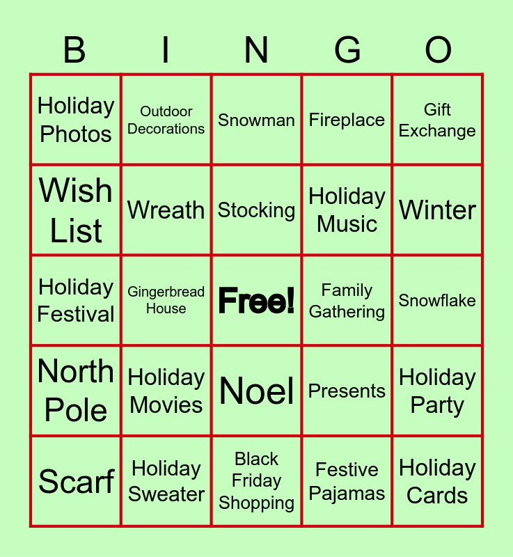 This bingo card has a free space and 49 words: Joy, Holiday Cards, Fruitcake, Black Friday Shopping, Holiday Movies, Holiday Baking, Outdoor Decorations, Holiday Lights, Wish List, Candy Canes, Wreath, Fireplace, Holiday Party, Presents, Hot Cocoa, Angel, Stocking, Family Gathering, Start, Gift Exchange, Gingerbread House, Festive Pajamas, Holiday Photos, Holiday Music, Eggnog, Winter, Scarf, Peppermint, Noel, North Pole, Mistletoe, Red, Bells, Cold, Holiday Sweater, Traveling, Ornament, Holiday Socks, Snowflake, Holiday Cheer, Poinsettia, Wrapping Paper, Ice Skating, Elf on the Shelf, Holiday Festival, Snowman, Nutcracker, Candle and Ribbons and Bows.