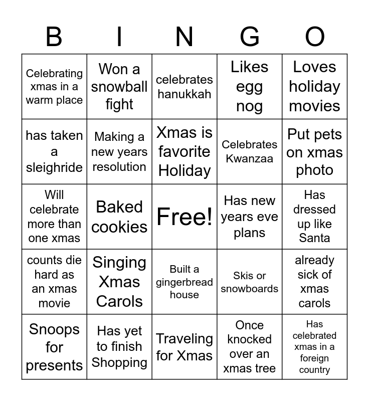 This bingo card has a free space and 24 words: Singing Xmas Carols, Has yet to finish Shopping, Xmas is favorite Holiday, Snoops for presents, Loves holiday movies, Celebrating xmas in a warm place, has taken a sleighride, Won a snowball fight, Has new years eve plans, Built a gingerbread house, Celebrates Kwanzaa, Will celebrate more than one xmas, Skis or snowboards, already sick of xmas carols, Making a new years resolution, Once knocked over an xmas tree, Has dressed up like Santa, celebrates hanukkah, Put pets on xmas photo, Baked cookies, Has celebrated xmas in a foreign country, counts die hard as an xmas movie, Likes egg nog and Traveling for Xmas.
