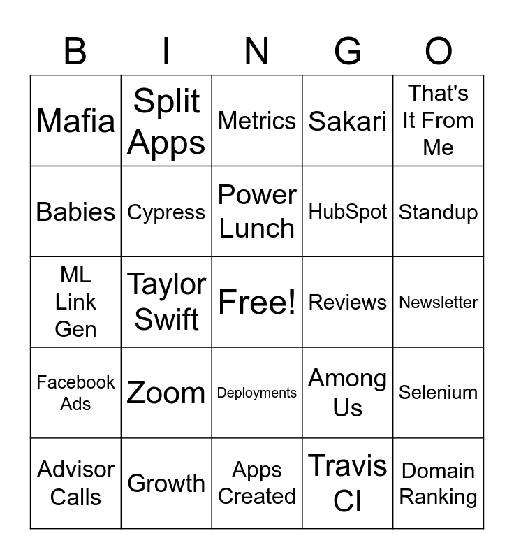 This bingo card has a free space and 24 words: Zoom, Growth, Power Lunch, Advisor Calls, That's It From Me, Mafia, Babies, Split Apps, Reviews, Deployments, HubSpot, ML Link Gen, Among Us, Selenium, Cypress, Travis CI, Newsletter, Metrics, Standup, Taylor Swift, Domain Ranking, Facebook Ads, Sakari and Apps Created.