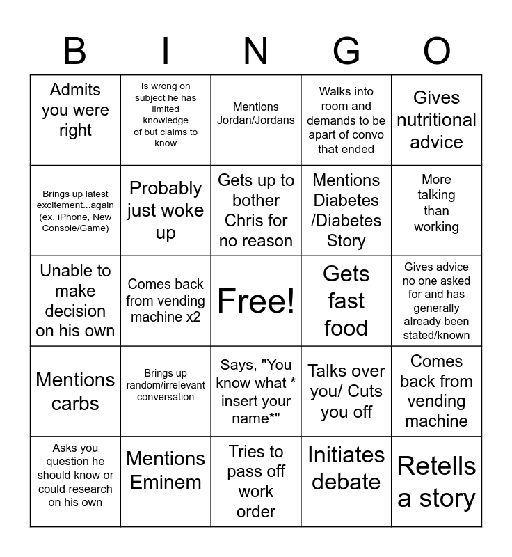 This bingo card has a free space and 24 words: Brings up random/irrelevant conversation, Mentions Eminem, Gets up to bother Chris for no reason, Asks you question he should know or could research on his own, Gives nutritional advice, Admits you were right, Brings up latest excitement...again (ex. iPhone, New Console/Game), Is wrong on subject he has limited knowledge of but claims to know, Gets fast food, Says, "You know what * insert your name*", Mentions Diabetes /Diabetes Story, Unable to make decision on his own, Talks over you/ Cuts you off, Comes back from vending machine, Probably just woke up, Initiates debate, Gives advice no one asked for and has generally already been stated/known, Mentions Jordan/Jordans, More talking than working, Comes back from vending machine x2, Retells a story, Mentions carbs, Walks into room and demands to be apart of convo that ended and Tries to pass off work order.
