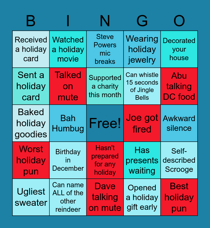 This bingo card has a free space and 24 words: Birthday in December, Can name ALL of the other reindeer, Supported a charity this month, Ugliest sweater, Decorated your house, Received a holiday card, Sent a holiday card, Watched a holiday movie, Joe got fired, Hasn't prepared for any holiday, Can whistle 15 seconds of Jingle Bells, Baked holiday goodies, Has presents waiting, Self-described Scrooge, Talked on mute, Opened a holiday gift early, Awkward silence, Steve Powers mic breaks, Abu talking DC food, Bah Humbug, Best holiday pun, Worst holiday pun, Wearing holiday jewelry and Dave talking on mute.