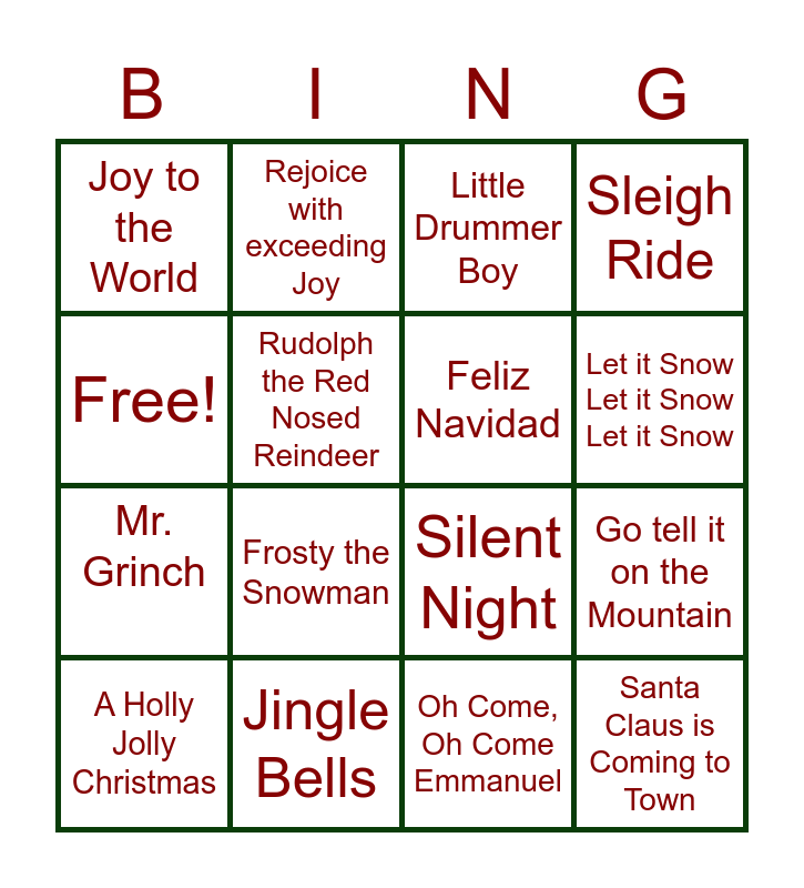 This bingo card has 16 words: Jingle Bells, Go tell it on the Mountain, Little Drummer Boy, Joy to the World, Mr. Grinch, Rejoice with exceeding Joy, Silent Night, Oh Come, Oh Come Emmanuel, Free!, Rudolph the Red Nosed Reindeer, A Holly Jolly Christmas, Sleigh Ride, Frosty the Snowman, Let it Snow Let it Snow Let it Snow, Feliz Navidad and Santa Claus is Coming to Town.