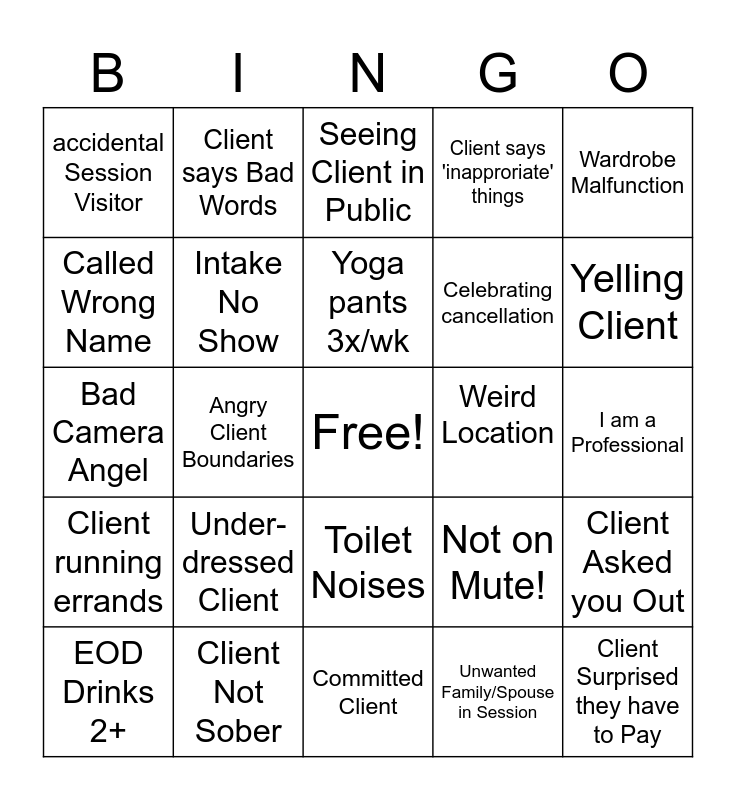 This bingo card has a free space and 24 words: Under-dressed Client, Client Not Sober, Yoga pants 3x/wk, EOD Drinks 2+, Wardrobe Malfunction, accidental Session Visitor, Called Wrong Name, Client says Bad Words, Weird Location, Toilet Noises, Celebrating cancellation, Bad Camera Angel, Not on Mute!, Client Asked you Out, Intake No Show, Unwanted Family/Spouse in Session, I am a Professional, Seeing Client in Public, Yelling Client, Angry Client Boundaries, Client Surprised they have to Pay, Client running errands, Client says 'inapproriate' things and Committed Client.