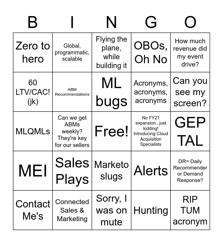 This bingo card has a free space and 40 words: Azure Immersion Workshop (Hi Brock), MLQMLs, Where are my leads?, ABM Recommendations, Connected Sales & Marketing, Marketo slugs, ML bugs, #listssues, How much revenue did my event drive?, MEI, Can we get ABMs weekly? They're key for our sellers, OBOs, Oh No, RIP TUM acronym, GEP TAL, No FY21 expansion...just kidding! Introducing Cloud Acquisition Specialists, Sales Plays, "Hello, Hello", Zero to hero, Bruce's winter coat, Flying the plane, while building it, DR= Daily Recommender or Demand Response?, Hunting, Acronyms, acronyms, acronyms, 60 LTV/CAC! (jk), Folloze, How many targeting tools do we have?, What does the v in vteam mean?, Domains, Matching, Customer journeys, Nurture mails, Contact Me's, Grinders, Alerts, Can you see my screen?, Sorry, I was on mute, Form Fills, Forecasts, Global, programmatic, scalable and MBR Template.