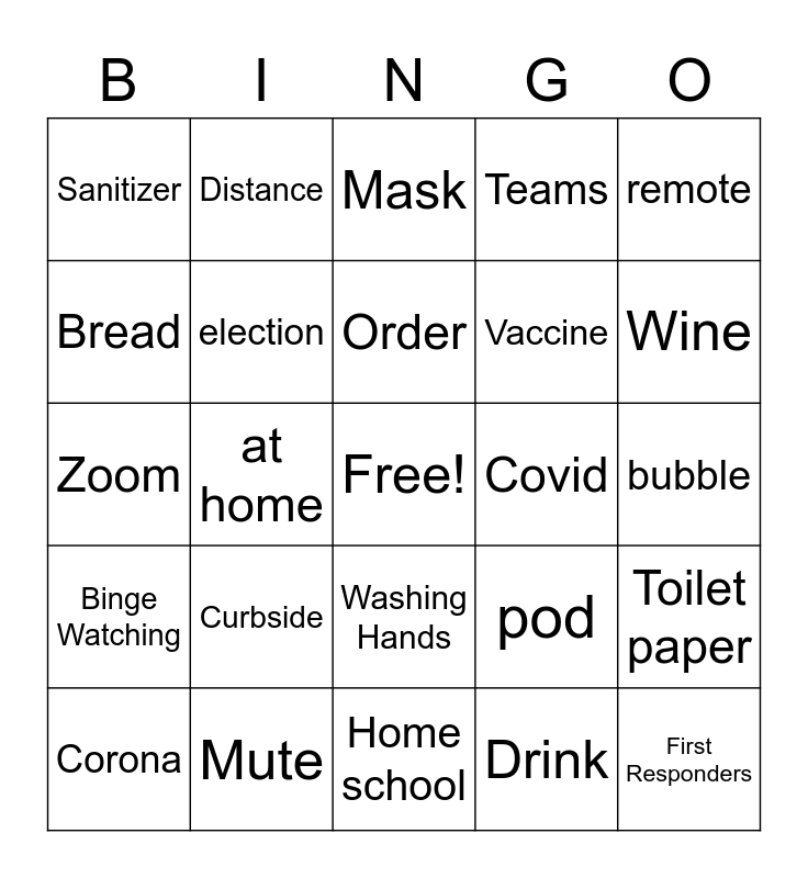 This bingo card has a free space and 28 words: Toilet paper, 2021, Vaccine, Drink, Bread, Mask, Distance, Binge Watching, Covid, Corona, Zoom, Teams, Mute, Home school, Wine, Delivery, Curbside, election, Order, Washing Hands, Sanitizer, Drive by, First Responders, at home, bubble, pod, remote and unprecedented.