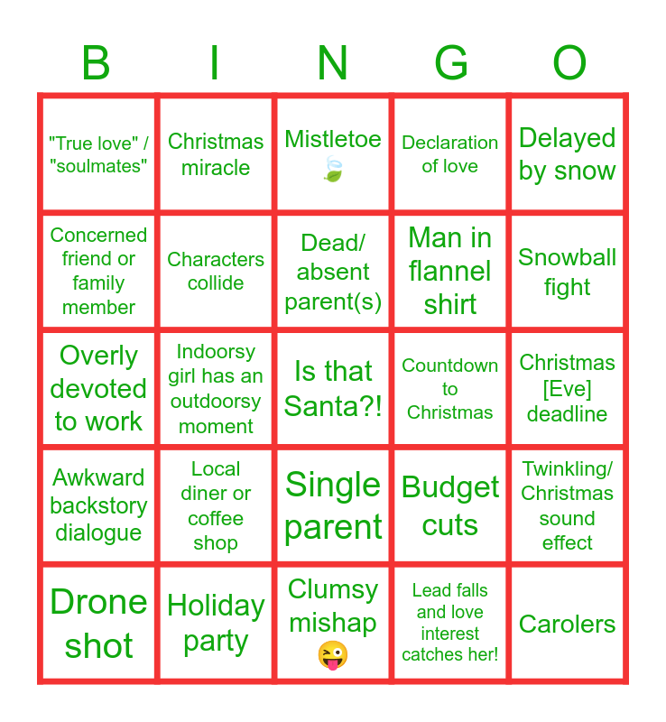 This bingo card has 73 words: "Bro", "sis", "The perfect gift", "True love" / "soulmates", "Well THAT wouldn't happen in covid times", A PROPOSAL💍, An unexpected/ uninvited guest, Awkward backstory dialogue, Bad love interest must go!, Budget cuts, Building a snowman ⛄️, Carolers, Celebrity or royalty, Characters collide, Christmas [Eve] deadline, Christmas magic ✨, Christmas miracle, Clumsy mishap 😜, Concerned friend or family member, Conniving side character(s), Countdown to Christmas, Dead/ absent parent(s), Declaration of love, Delayed by snow, Driving on snowy road, Drone shot, Finding the perfect tree, Flawless Black man, Flour fight/baking scene, Gay side character, Hanging ornaments/ decorations, Holiday party, Homecoming, Horse-drawn carriage, Hot cocoa ☕️, Indoorsy girl has an outdoorsy moment, Inheritence, Inner monologue, Interrupted smooch, Is that Santa?!, Kid wants a new parent, Lead falls and love interest catches her!, Local diner or coffee shop, Love interes from the past!, Love interest from the past!, Love interest has a dog, Man in flannel shirt, Mistletoe 🍃, Montage, Obviously made up town/country name, Overly devoted to work, Quaint town, Quirky kid 🧒🏽, Rushing to/from the airport/train or bus station, Santa hat, Say the name of the movie, Sentimental Christmas object, Shirtless guy, Single parent, Sledding, Small business in trouble!, Small town mechanic, barista, or other charming job, Small town/big city, Snow angel 👼🏾, Snowball fight, The true meaning/spirit of Christmas, Time jump, Tradition, Tree lighting 🎄, Twinkling/ Christmas sound effect, Vague big city job lingo, White Christmas ❄️, Will they choose work or Christmas?! and Wise old townie.