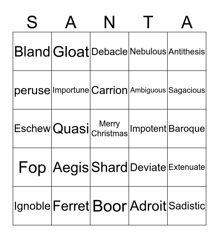 This bingo card has a free space and 25 words: Aegis, Boor, Carrion, Ignoble, Antithesis, Bland, peruse, Gloat, Impotent, Shard, Ambiguous, Eschew, Deviate, Extenuate, Importune, Optimum, Baroque, Debacle, Sagacious, Quasi, Sadistic, Ferret, Fop, Nebulous and Adroit.