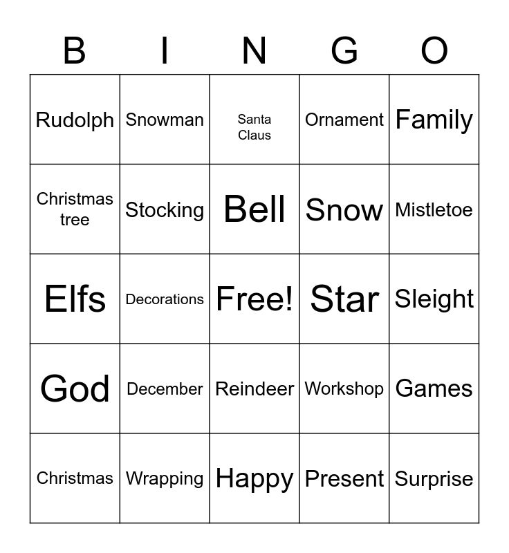 This bingo card has a free space and 24 words: Christmas, December, Bell, Present, Family, Rudolph, Snowman, Santa Claus, Star, Sleight, Elfs, Stocking, Workshop, Games, Christmas tree, Wrapping, Happy, Ornament, Mistletoe, God, Decorations, Reindeer, Snow and Surprise.