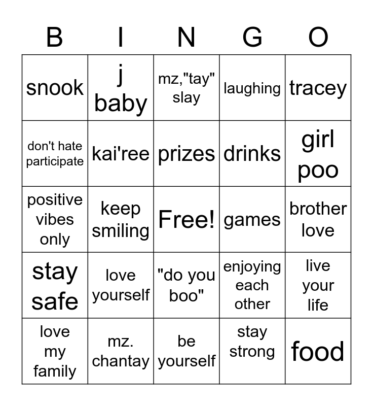 This bingo card has a free space and 24 words: love yourself, mz. chantay, prizes, love my family, tracey, snook, don't hate participate, j baby, games, "do you boo", drinks, positive vibes only, enjoying each other, live your life, kai'ree, stay strong, brother love, mz,"tay" slay, girl poo, keep smiling, food, stay safe, laughing and be yourself.