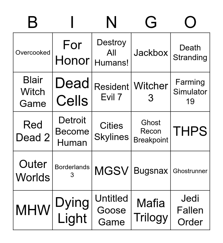 This bingo card has a free space and 24 words: Borderlands 3, Dying Light, Resident Evil 7, MHW, Death Stranding, Overcooked, Blair Witch Game, For Honor, Ghost Recon Breakpoint, MGSV, Witcher 3, Red Dead 2, Bugsnax, Ghostrunner, Dead Cells, Mafia Trilogy, THPS, Destroy All Humans!, Farming Simulator 19, Detroit Become Human, Jedi Fallen Order, Outer Worlds, Jackbox and Untitled Goose Game.