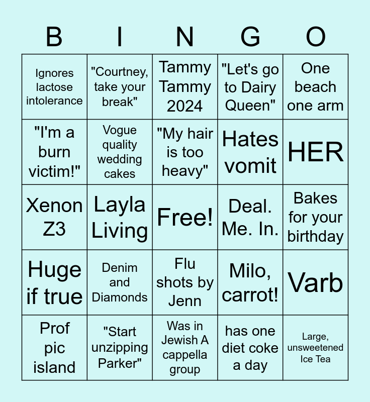 This bingo card has a free space and 34 words: Refuses to open an etsy store, has one diet coke a day, *makes gourmet meal*: "it was nothing", "Play with my hairs", Huge if true, Vogue quality wedding cakes, One beach one arm, Prof pic island, "Courtney, take your break", Bows on bald babies, "My hair is too heavy", Tammy Tammy 2024, "Every day is game day", Life in Eden changed, Deal. Me. In., HER, "Start unzipping Parker", Xenon Z3, Denim and Diamonds, Milo, carrot!, Flu shots by Jenn, Sarahsbug Livesher, Ignores lactose intolerance, Bakes for your birthday, Was in Jewish A cappella group, Large, unsweetened Ice Tea, "Let's go to Dairy Queen", "Ee-LIE-za", Hates vomit, "I'm a burn victim!", "Prahaha", Layla Living, Varb and *writes wedding toasts for rich people*.