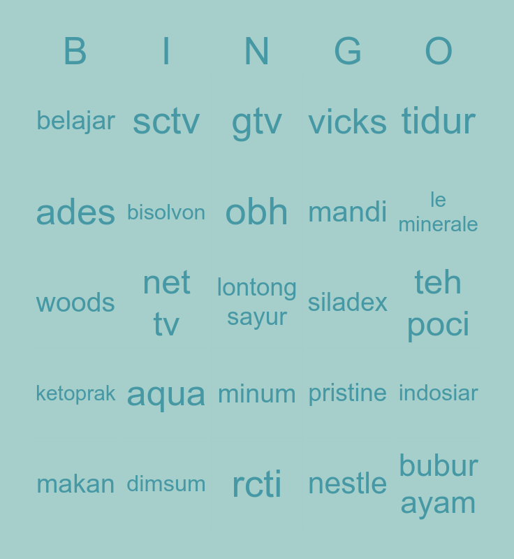 This bingo card has 25 words: aqua, rcti, obh, makan, tidur, belajar, ades, sctv, siladex, minum, mandi, woods, pristine, indosiar, bisolvon, bubur ayam, teh poci, gtv, le minerale, net tv, lontong sayur, dimsum, ketoprak, vicks and nestle.