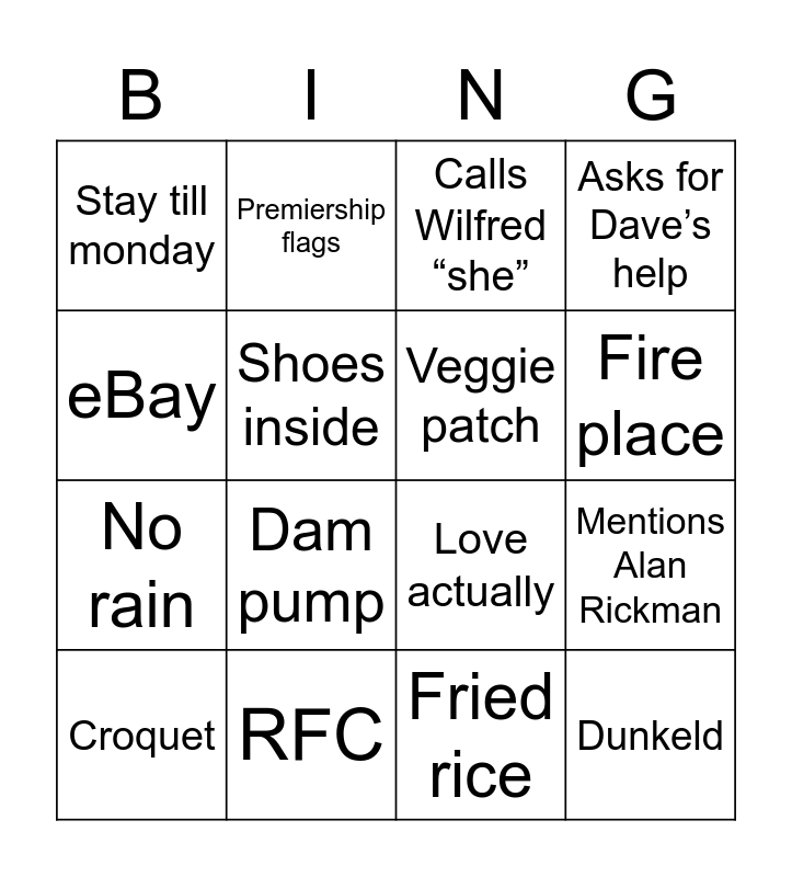 This bingo card has 16 words: RFC, Mentions Alan Rickman, Calls Wilfred “she”, Stay till monday, No rain, Premiership flags, Love actually, Fried rice, eBay, Shoes inside, Croquet, Asks for Dave’s help, Dam pump, Fire place, Veggie patch and Dunkeld.