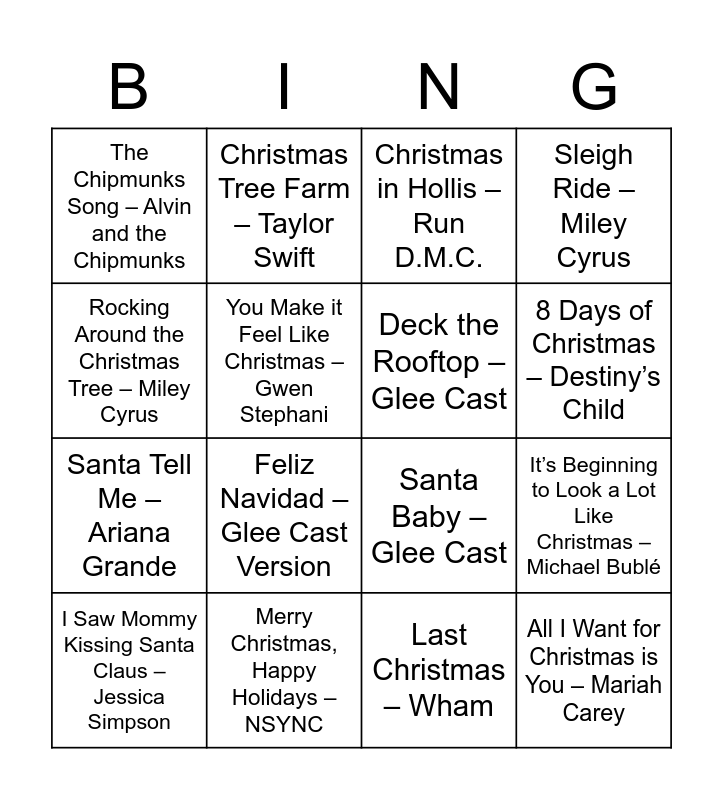 This bingo card has 23 words: All I Want for Christmas is You – Mariah Carey, Mistletoe – Justin Bieber, 8 Days of Christmas – Destiny’s Child, Baby It’s Cold Outside – Kelly Clarkson and John Legend, Rocking Around the Christmas Tree – Miley Cyrus, The Chipmunks Song – Alvin and the Chipmunks, You Make it Feel Like Christmas – Gwen Stephani, Christmas Tree Farm – Taylor Swift, I Saw Mommy Kissing Santa Claus – Jessica Simpson, My Only Wish (This Year) – Brittney Spears, Feliz Navidad – Glee Cast Version, Santa Tell Me – Ariana Grande, You’re a Mean One Mr. Grinch – Thurl Ravenscroft, The Chanukah Song – Adam Sandler, Merry Christmas, Happy Holidays – NSYNC, What Christmas Means to Me – Stevie Wonder, Christmas in Hollis – Run D.M.C., Santa Baby – Glee Cast, Deck the Rooftop – Glee Cast, It’s Beginning to Look a Lot Like Christmas – Michael Bublé, Sleigh Ride – Miley Cyrus, Last Christmas – Wham and Cozy Little Christmas – Katy Perry.