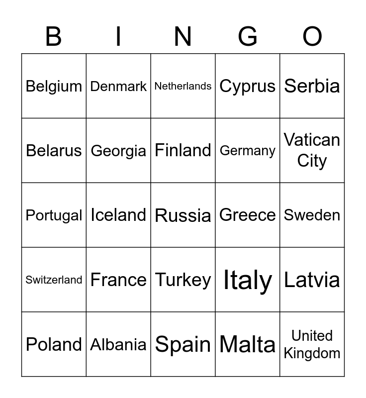 This bingo card has a free space and 24 words: France, Albania, Finland, Poland, Serbia, Belgium, Belarus, Denmark, Greece, Turkey, Germany, Portugal, Italy, Latvia, Georgia, Malta, Sweden, Netherlands, Vatican City, Iceland, United Kingdom, Switzerland, Cyprus and Spain.