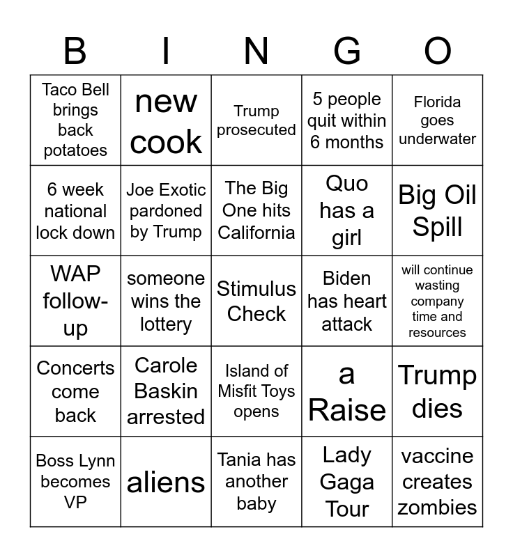 This bingo card has 25 words: Carole Baskin arrested, Tania has another baby, The Big One hits California, Boss Lynn becomes VP, Florida goes underwater, Taco Bell brings back potatoes, 6 week national lock down, new cook, Biden has heart attack, Island of Misfit Toys opens, Quo has a girl, WAP follow-up, a Raise, Trump dies, Joe Exotic pardoned by Trump, vaccine creates zombies, will continue wasting company time and resources, Trump prosecuted, Big Oil Spill, someone wins the lottery, Stimulus Check, aliens, Concerts come back, 5 people quit within 6 months and Lady Gaga Tour.