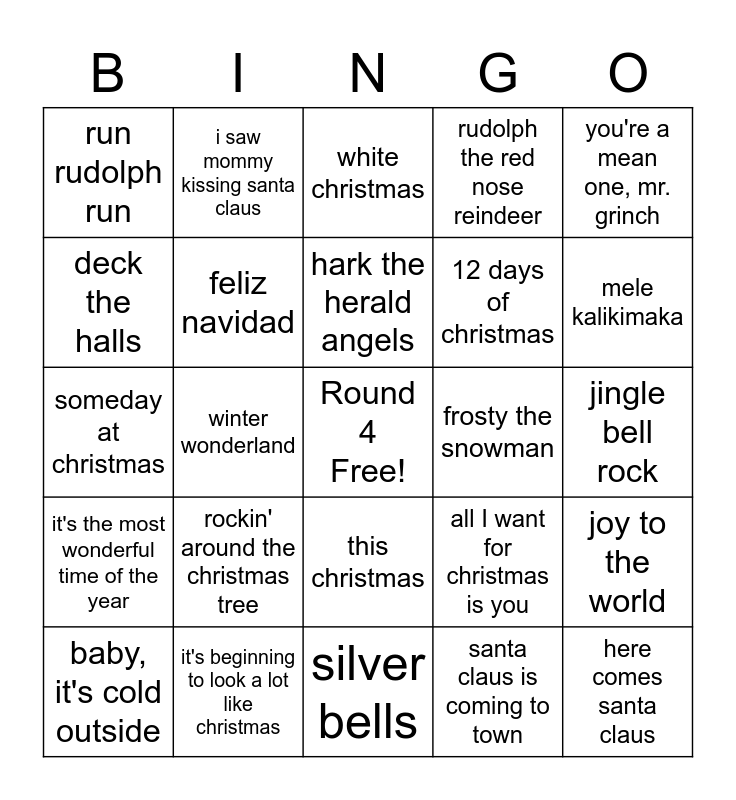 This bingo card has a free space and 29 words: baby, it's cold outside, a holly jolly christmas, winter wonderland, let it snow! let it snow! let it snow!, run rudolph run, white christmas, feliz navidad, rockin' around the christmas tree, frosty the snowman, it's beginning to look a lot like christmas, jingle bell rock, here comes santa claus, silver bells, santa claus is coming to town, mele kalikimaka, up on the housetop, this christmas, it's the most wonderful time of the year, you're a mean one, mr. grinch, someday at christmas, all I want for christmas is you, santa tell me, 12 days of christmas, deck the halls, rudolph the red nose reindeer, i saw mommy kissing santa claus, joy to the world, hark the herald angels and we wish you a merry christmas.