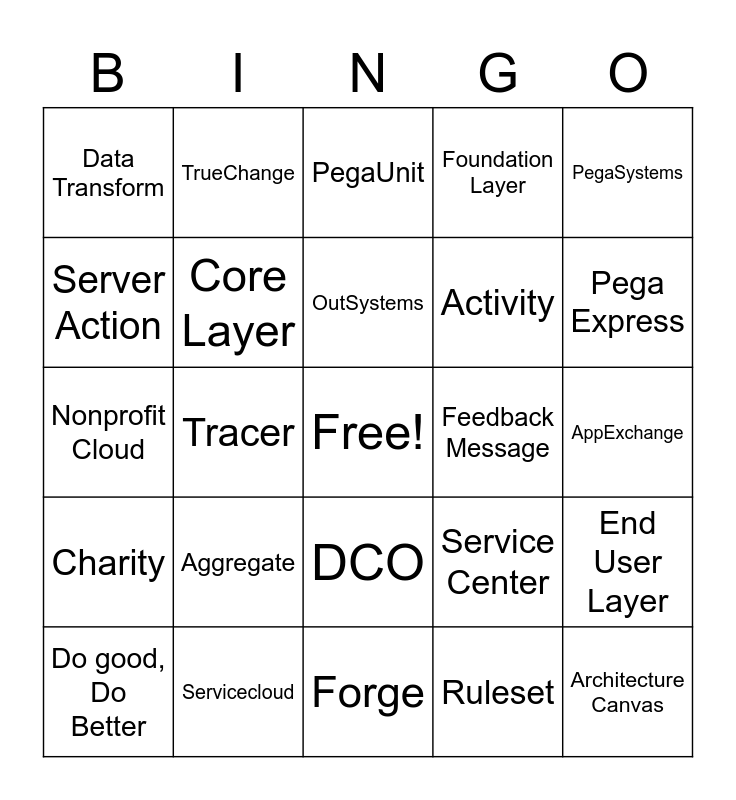 This bingo card has a free space and 50 words: Rapid, Architecture Canvas, One-Click Deploy, Forge, Aggregate, Espace, TrueChange, Dependencies, Server Action, Preparation, Core Layer, Foundation Layer, End User Layer, Service Center, Service Studio, Architecture Dashboard, OutSystems, Feedback Message, Rule, PegaSystems, Tracer, Ruleset, Data Transform, Activity, Decision Tree, App Studio, Pega Express, Skimming, PegaUnit, DCO, Clipboard, Live UI, CaseType, Salescloud, Servicecloud, Apex, Lightning, AURA, MVC, AppExchange, MetaData, Layers, Javascript, CRM, Do good, Do Better, Nonprofit Cloud, Education Cloud, Customer Success, Charity and Tech First, Test Second.