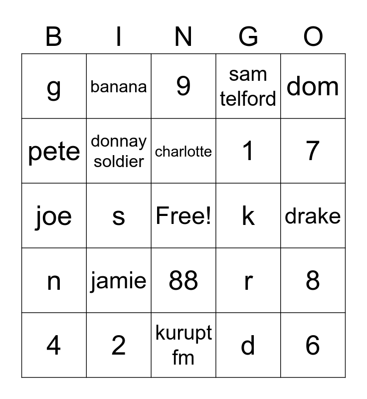 This bingo card has a free space and 35 words: novo, la roux, craig, donnay soldier, 88, sam telford, pete, dave, charlotte, megan, joe, dom, katia, r, g, k, d, s, n, 6, r, 4, 8, 2, 9, 7, 5, 3, 1, drake, jay paul, kurupt fm, jamie, banana and apple.