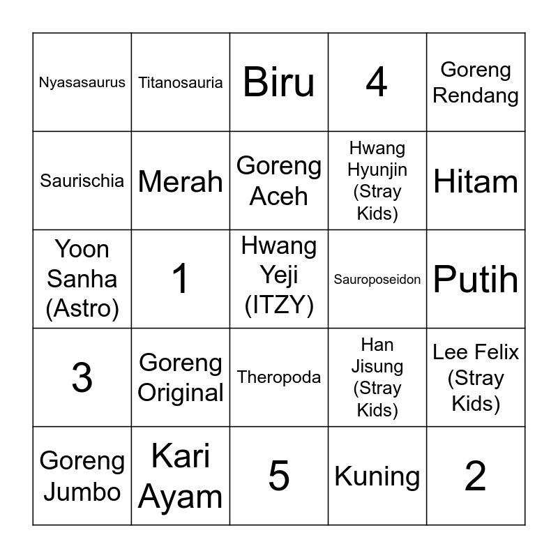 This bingo card has a free space and 24 words: Goreng Original, Kari Ayam, Goreng Aceh, Goreng Jumbo, Goreng Rendang, Nyasasaurus, Saurischia, Titanosauria, Sauroposeidon, Theropoda, Hwang Hyunjin (Stray Kids), Yoon Sanha (Astro), Han Jisung (Stray Kids), Lee Felix (Stray Kids), Merah, Kuning, Putih, Biru, Hitam, 1, 2, 3, 4 and 5.