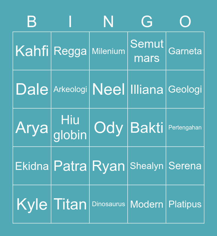 This bingo card has a free space and 24 words: Patra, Titan, Neel, Kyle, Garneta, Kahfi, Dale, Regga, Bakti, Ryan, Illiana, Arya, Shealyn, Serena, Arkeologi, Modern, Pertengahan, Milenium, Geologi, Hiu globin, Platipus, Ekidna, Semut mars and Dinosaurus.