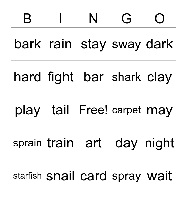 This bingo card has a free space and 25 words: train, card, bar, starfish, dark, bark, hard, rain, carpet, art, shark, play, day, night, fight, paid, may, stay, clay, tail, wait, snail, sprain, sway and spray.
