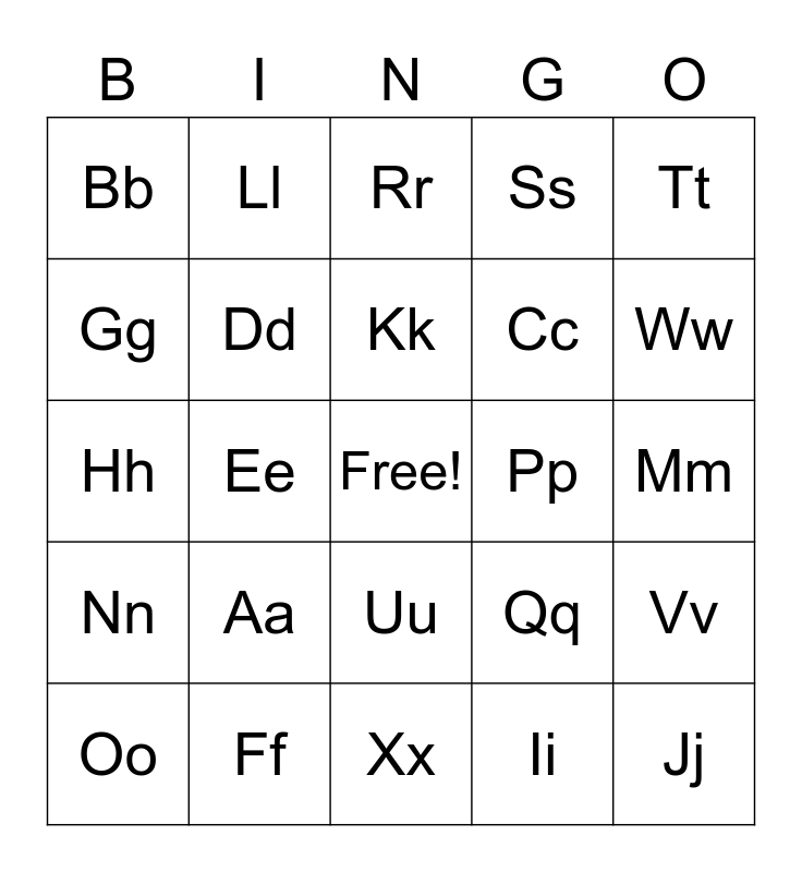 This bingo card has a free space and 24 words: Aa, Ff, Kk, Oo, Tt, Bb, Gg, Ll, Pp, Uu, Cc, Hh, Qq, Vv, Dd, Ii, Mm, Rr, Ww, Ee, Jj, Nn, Ss and Xx.