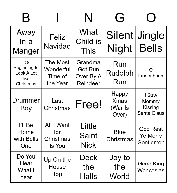 This bingo card has a free space and 52 words: You’re A Mean One, Mr. Grinch, Good King Wenceslas, Rudolph the Red Nosed Reindeer, Deck the Halls, All I Want for Christmas Is You, Have Yourself A Merry Little Christmas, Feliz Navidad, Winter wonderland, It’s Beginning to Look A Lot like Christmas, Santa Claus Is Comin’ to Town, The Most Wonderful Time of the Year, Mele Kalikimaka, God Rest Ye Merry Gentlemen, Blue Christmas, The First Noel, Let It Snow, Grandma Got Run Over By A Reindeer, Happy Xmas (War Is Over), White Christmas, Jingle Bells, Last Christmas, Joy to the World, Away In a Manger, Run Rudolph Run, O Holy Night, Jingle Bell Rock, Merry Christmas, Happy Holidays, O Come All Ye Faithful, O Tannenbaum, I’ll Be Home for Christmas, All I Want for Christmas Is My Two Front Teeth, Silent Night, Baby its Cold Outside, Holly Jolly Christmas, Go Tell It on the Mountain, What Child is This, Up On the House Top, Rockin’ Around The Christmas Tree, Mistress For Christmas (AC/DC), I Want a Hippopotamus for Christmas, Hark! The Herald Angels Sing, I Saw Mommy Kissing Santa Claus, I’ll Be Home with Bells One, Christmas Time (Back Street Boys), Little Saint Nick, Frosty The Snowman, Christmas Don’t Be Late, Drummer Boy, Silver Bells, Carol of the Bells, Do You Hear What I hear and Santa Baby.