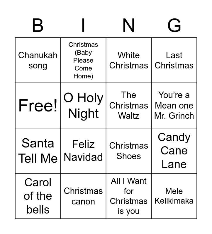 This bingo card has 16 words: Christmas canon, Candy Cane Lane, White Christmas, Chanukah song, Santa Tell Me, Christmas (Baby Please Come Home), Christmas Shoes, All I Want for Christmas is you, Free!, O Holy Night, Carol of the bells, Last Christmas, Feliz Navidad, You’re a Mean one Mr. Grinch, The Christmas Waltz and Mele Kelikimaka.