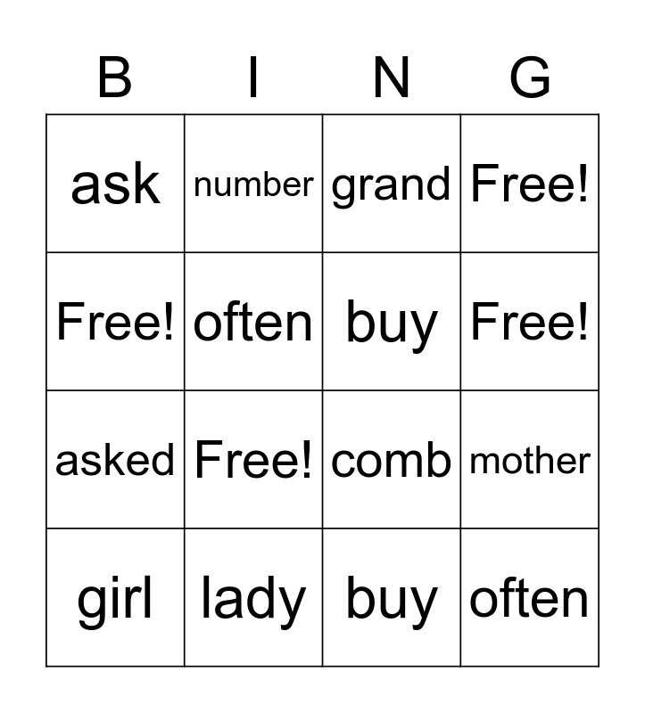 This bingo card has 16 words: lady, mother, grand, ask, asked, number, comb, buy, Free!, often, girl, Free!, Free!, Free!, buy and often.