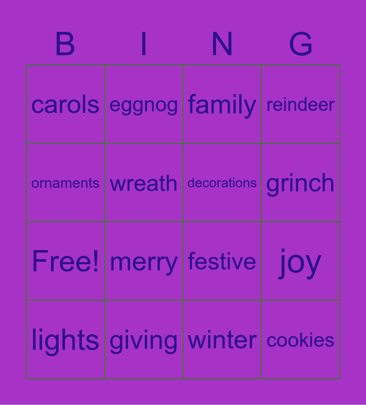 This bingo card has 20 words: joy, presents, family, traditions, lights, ornaments, giving, carols, Free!, eggnog, merry, festive, wreath, cookies, decorations, snow, grinch, reindeer, winter and green.