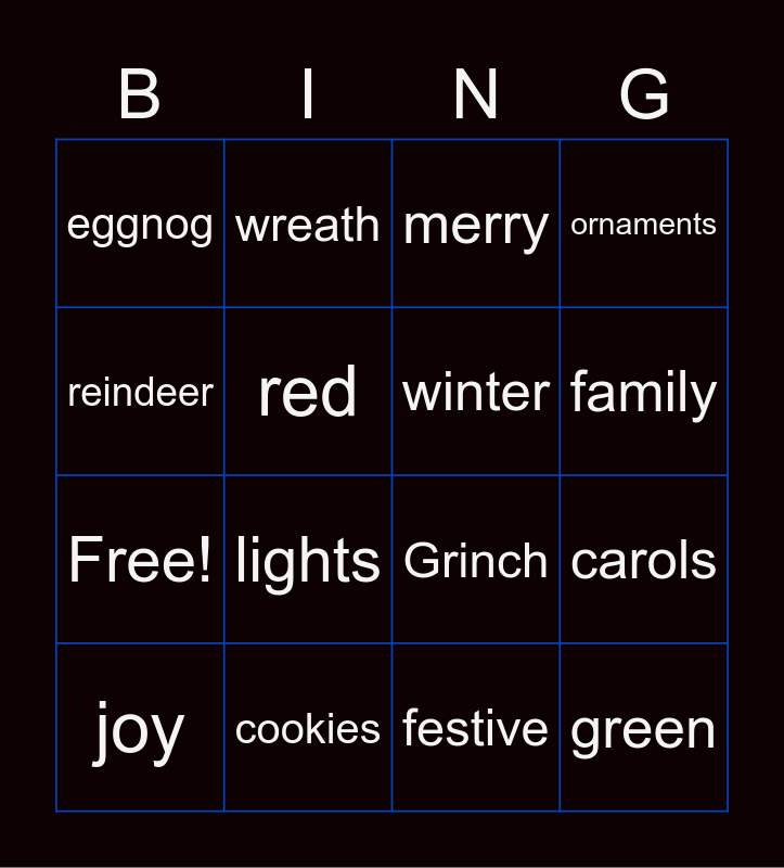 This bingo card has 20 words: carols, presents, merry, snow, joy, reindeer, cookies, eggnog, Free!, wreath, lights, Grinch, red, green, winter, giving, family, ornaments, festive and traditions.