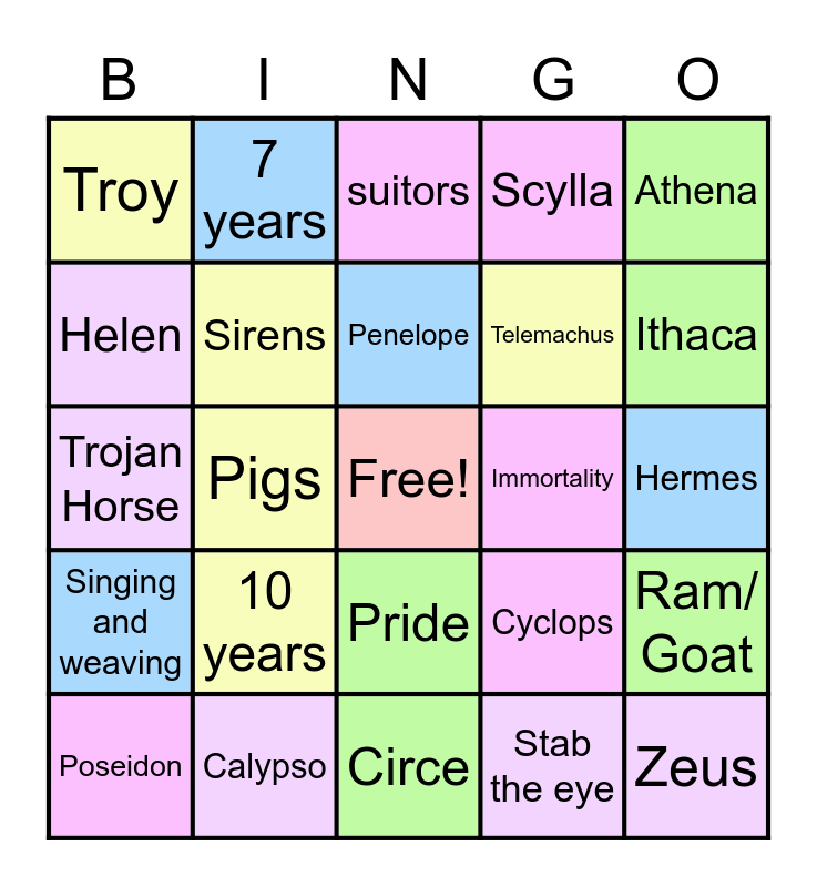 This bingo card has a free space and 24 words: 10 years, Calypso, Penelope, Poseidon, Athena, Troy, Helen, 7 years, Immortality, Pride, Telemachus, Trojan Horse, Cyclops, Ram/ Goat, Sirens, Stab the eye, Hermes, suitors, Ithaca, Pigs, Zeus, Singing and weaving, Scylla and Circe.