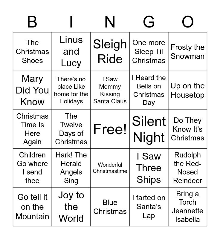 This bingo card has a free space and 67 words: Little Drummer Boy, Do you hear what I hear?, Santa Baby, Rudolph the Red-Nosed Reindeer, Silver Bells, Carol of the Bells, Linus and Lucy, The Chipmunk Song, I Saw Mommy Kissing Santa Claus, Little Saint Nick, Wonderful Christmastime, Hallelujah, Do They Know It’s Christmas, Frosty the Snowman, Christmas Bells are Ringing, Mary Did You Know, The Twelve Days of Christmas, The Christmas Shoes, Christmas Time is Here, I Heard the Bells on Christmas Day, Hark! The Herald Angels Sing, Children Go where I send thee, One more Sleep Til Christmas, I farted on Santa’s Lap, Monster’s Holiday, Pretty Paper, Please Daddy (Don’t Get Drunk This Christmas), There is No Christmas Like a Home Christmas, Up on the Housetop, What are you doing new year’s eve, Bring a Torch Jeannette Isabella, Toyland, Coventry Carol, The Holly and the Ivy, Rockin around the Christmas Tree, Go tell it on the Mountain, Hard Candy Christmas, I Saw Three Ships, Christmas Time Is Here Again, What Child is This, Baby It’s Cold Outside, There’s no place Like home for the Holidays, Silent Night, All I want For Christmas is my two Front Teeth, Oh Come all Ye Faithful, someday at Christmas, Jingle Bell Rock, Joy to the World, Last Christmas, White Christmas, Sleigh Ride, the First Noel, Let it Snow, Grandma got ran over by a Reindeer, The Christmas Song, Blue Christmas, feliz Navidad, Walking in a winter wonderland, It’s beginning to look a lot like Christmas, Santa Claus is coming to Town, It’s the Most Wonderful Time of the Year, Deck the Halls, All I want for Christmas is You, Have yourself a Merry Little Christmas, Underneath theTree, You’re a Mean one Mr Grinch and Good King Wenceslas.
